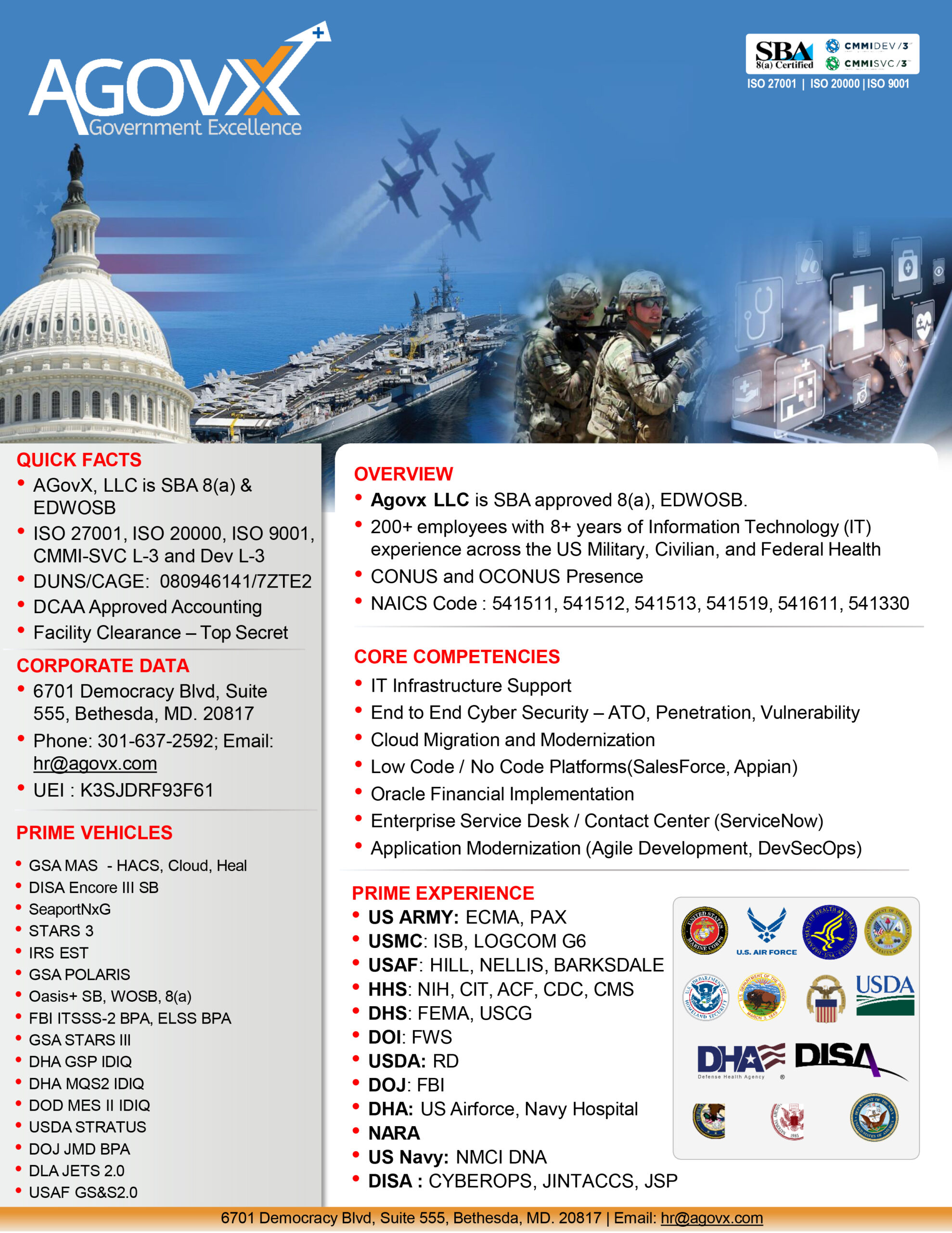 Established in 2016, AGovx is an SBA 8(a) certified EDWOSB with offices in Bethesda, MD and McLean, VA. We deliver a broad range of mission-critical technology and business solutions to Department of Defense, Federal Health, and Civilian agencies across CONUS and OCONUS. Our core capabilities include IT Service Management (ITSM), Cybersecurity and Cyber Operations, Cloud Adoption and Infrastructure Support, DevOps and Agile Delivery, Enterprise IT Management, Data Engineering and Analytics, Artificial Intelligence solutions, and Low-Code/Platform implementations. AGOVX is ISO 20000:2018, ISO 27001:2013, and ISO 9001:2015 certified, CMMC Level 2 compliant, and appraised at CMMI Level III for Services and Application Development, demonstrating our commitment to quality, security, and operational excellence.